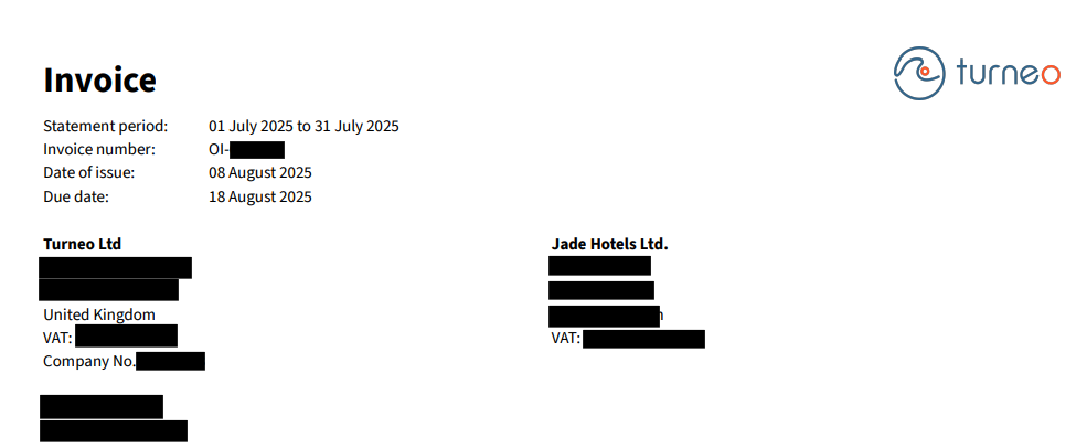- Your company details: Shows the name, address, and VAT number (if applicable) provided in your Turneo profile.