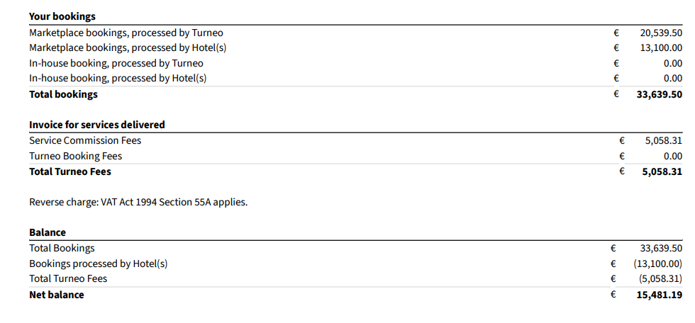 Your monthly invoice gives you a clear overview of your bookings, Turneo’s fees, and your final payout amount. Here’s how to navigate each section: