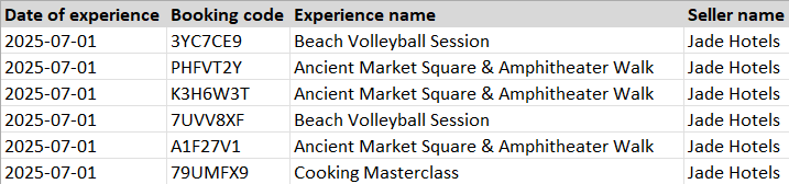 Your booking list Excel gives you a transparent breakdown of all completed bookings within the invoicing period. It helps you verify totals, check commission calculations, and track where payments were processed.