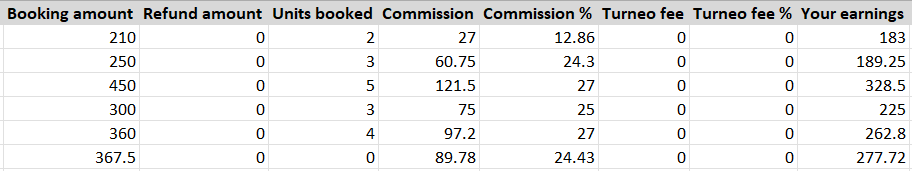 - Turneo fee & Turneo fee %: Additional booking fees (for organizers these are always 0).
